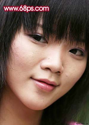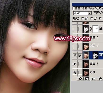 + Alt + Shift + E盖印图层,执行:滤镜 > 模糊 > 高斯模糊,数值为8,确定后按住Alt键加上图层蒙版,然后把前景颜色设置为白色,选择画笔工具在人物脸上涂抹,脸部边缘及五官轮廓部分不要涂抹,头发周围可以涂抹下,大致涂好的效果如图2。