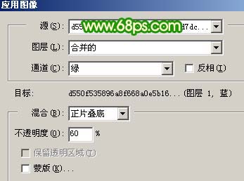 1、打开原图素材,按Ctrl + J复制一层,得到图层1,然后点通道面板,选择蓝色通道,执行:图像 > 应用图像,参数设置如图