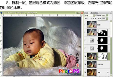 2、复制一层,图层混合模式改为“滤色”,添加图层蒙版,在曝光过度的地方用黑色涂抹。