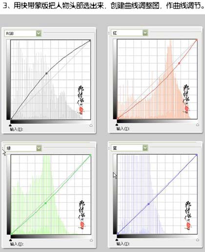 3、用快速蒙版把人物头部选出来,创建曲线调整图层,做曲线调整,参数及效果如下图。