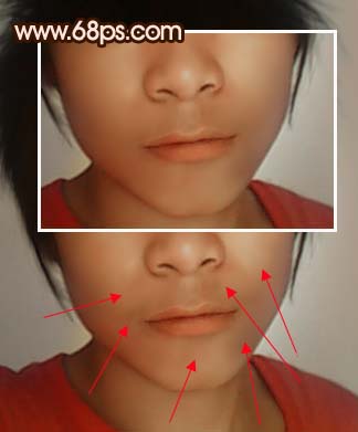 > 模糊 > 高斯模糊,数值为12,确定后按住Alt键加上图层蒙版,然后用白色画笔在图9箭头所示的地方涂抹,把有色块的地方涂掉。