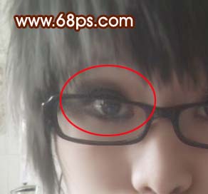 5、新建一个图层,盖印图层,这一步要去掉人物左眼上部的黑色部分如图7红圈位置,先用吸管吸取周围皮肤的颜色,然后用画笔,透明度为10%左右,轻轻点黑圈部分,吸取颜色的时候涂哪个需要吸取最近的皮肤颜色,效果如图8。