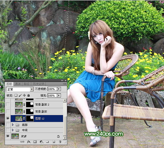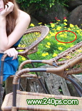 7、按住Alt键在下图红色区域取样(取样尽量选择椅子附近比较完好的花草),图文教程可能看得有点吃力,可以输入图片中网址查看视频教程。