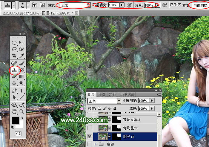 6、选择仿制图章工具,在属性栏把模式设置为“正常”,不透明度及流量都设置为100%,样本选择“当前图层”,如下图。