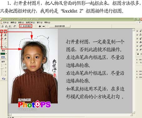 1、打开素材图片,把人物及背景的阴影一起勾出来,抠图方法很多只要把涂抠好就行。