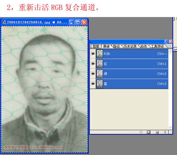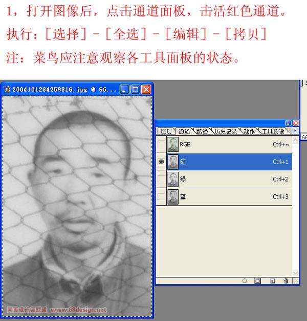 1、打开图像后,点击进入通道面板,击活红色通道,执行:选择-全选,再选择编辑-拷贝。