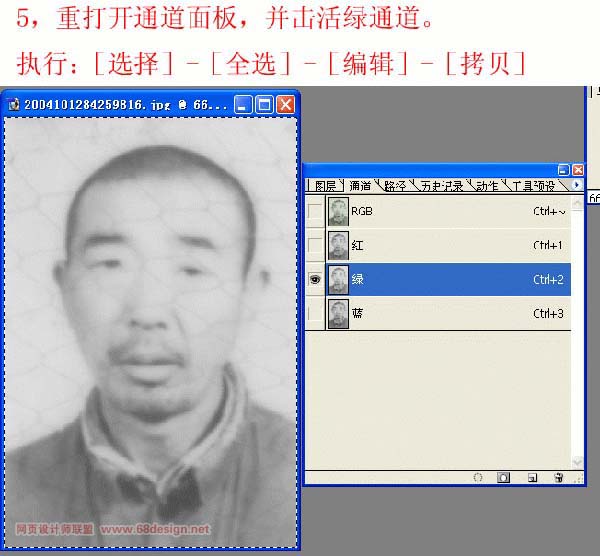 5、重打开通道面板,并击活绿通道,执行:选择-全选,再选择编辑-拷贝。