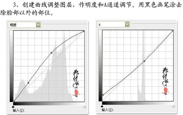 3、创建曲线调整图层,做明度和a通道调节。参数设置如下图,确定后用黑色画笔图去除脸部以外的部位。