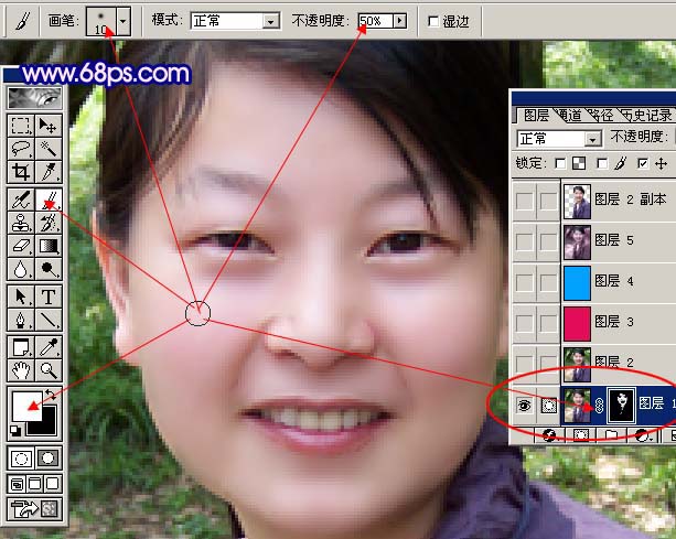 + J把背景图层复制一层,执行:滤镜 > 模糊 > 高斯模糊,数值为3,确定后按住Alt键加上图层蒙版,然后选择画笔工具透明度为:50%,把前景颜色设置为白色,然后在人物脸上有杂色的地方涂抹,给人物磨皮,效果如图2。