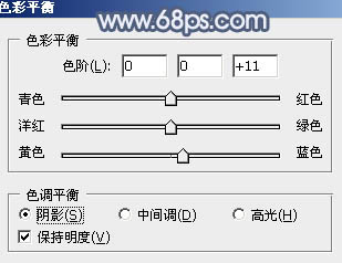 9、创建色彩平衡调整图层,对阴影,高光进行调整,参数设置如图22,23,确定后按Ctrl + Alt + G 创建剪切蒙版,效果如图24。这一步微调人物肤色。