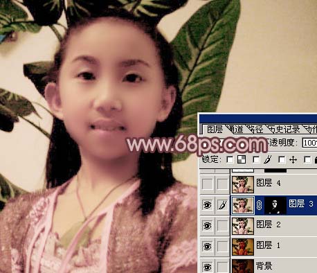 + J把应用图像后的图层复制一份,执行菜单:滤镜 > 模糊 > 高斯模糊,数值为3,确定后加上图层蒙版,填充黑色,然后用白色画笔涂抹皮肤及有杂色的地方,有轮廓的地方不要涂。效果与图层参照如图5。