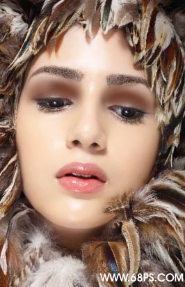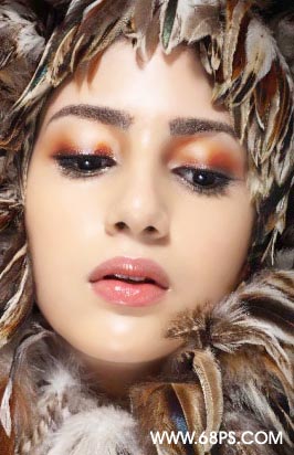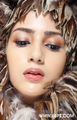 + Shift + Alt + E 盖印图层,然后再新建一个图层用画笔工具,前景颜色设为:#743F2D,在眼睛上面涂出图3所示的图形,然后把图层混合模式改为“叠加”,效果如图4。