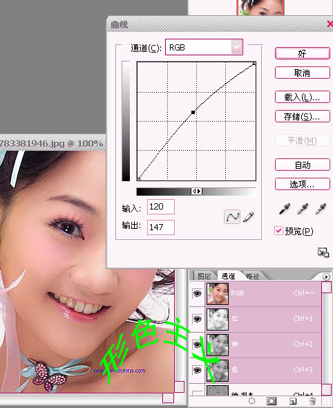 ALPHA 3的选区.回到RGB面版,按Ctrl + Shift + I 反选。再按Ctrl + M 调曲线,参数设置如下图