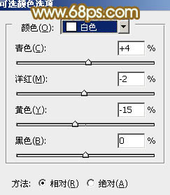 5、创建可选颜色调整图层,对黄,白进行调整,参数设置如图16,17,效果如图18。这一步给图片增加橙黄色。
