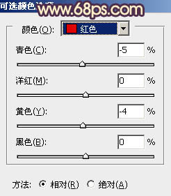 8、创建可选颜色调整图层,对红,黄进行调整,参数及效果如下图。这一步给图片增加一点洋红色。