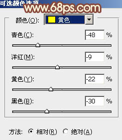 3、创建可选颜色调整图层,对红,黄进行调整,参数设置如图6,7,效果如图8。这一步把图片中的橙黄色调淡。