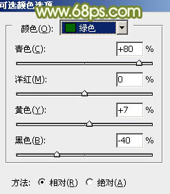 3、创建可选颜色调整图层,对红,绿进行调整,参数设置如图4,5,效果如图6。这一步把绿色部分稍微调淡一点。