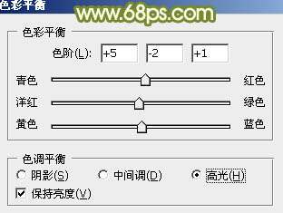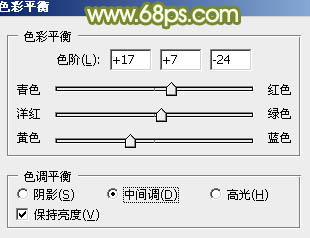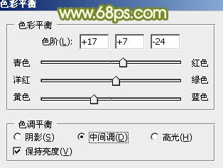6、创建色彩平衡调整图层,对中间调及高光部分进行调整,参数设置如图13,14,确定后把蒙版填充黑色,用白色画笔把人物脸部及肤色部分擦出来,效果如图15。这一步把人物肤色部分调红润。