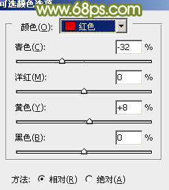 7、创建可选颜色调整图层,对红、绿、白进行调整,参数设置如图16 - 18,效果如图19。这一步主要微调人物肤色。