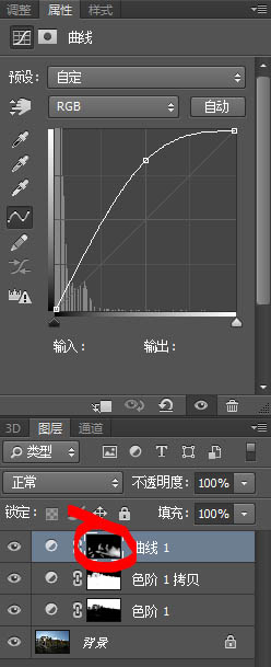 8、感觉树木、地面的高光区还不够亮,画面略显压抑。创建一个“曲线”调整层,调节参数如图,然后将蒙版填充为黑色。