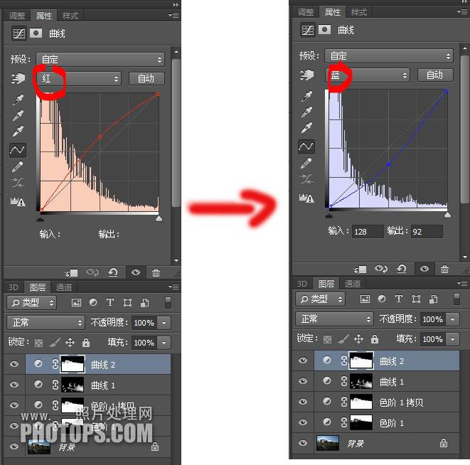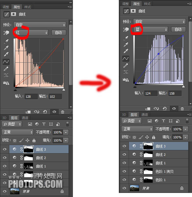 创建一个“曲线”调整层,由于我们提前载入了“色阶2”的蒙版通道,可以保证我们这一步的调整不会影响到天空的颜色。在“红”通道中将曲线上提;“蓝”通道中将曲线下拉。