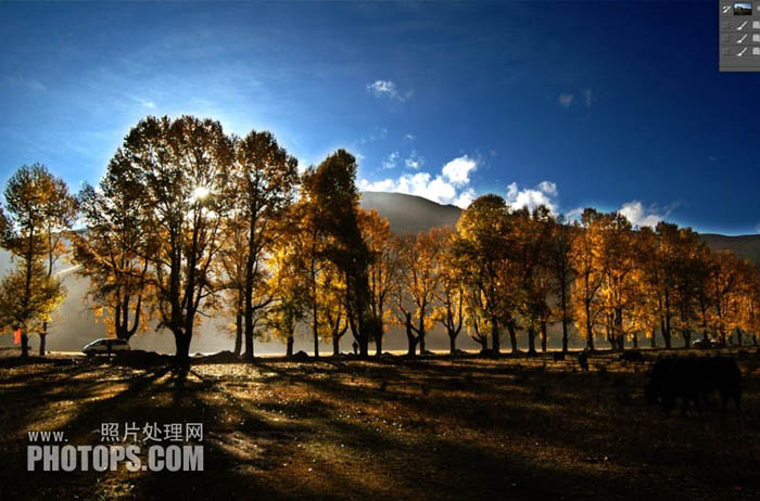 13、很明显,图像中地面、树木的色调变暖,阳光显得更通透、强烈。