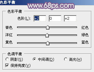 7、创建色彩平衡调整图层,对阴影、中间调、高光进行调整,参数设置如图20 - 22,效果如图23。这一步主要给图片暗部增加紫色。