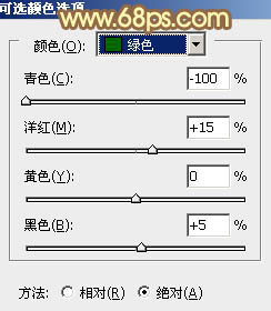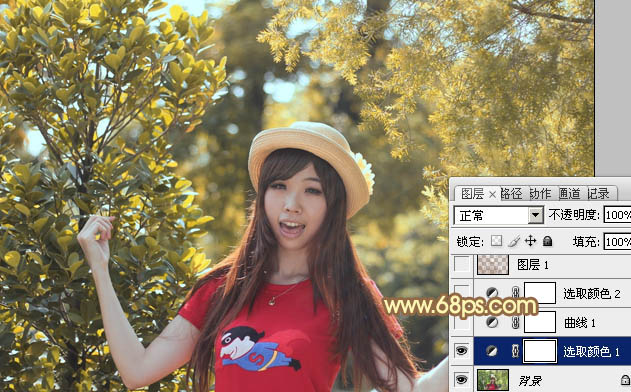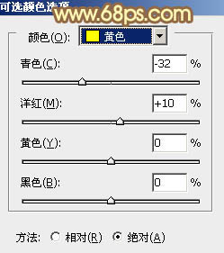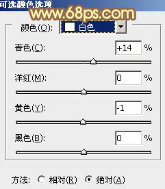 1、打开素材图片,创建可选颜色调整图层,对黄、绿、青、白进行调整,参数设置如图1 - 4,效果如图5。这一步把背景部分的主色转为橙黄色。