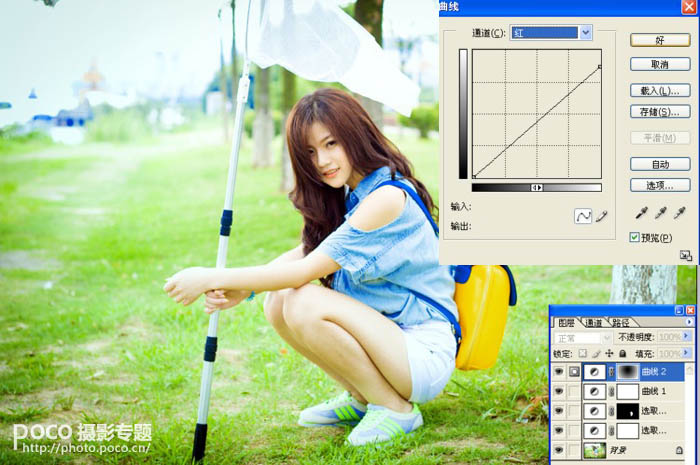 8、红色通道对白色进行调整,是天空偏蓝偏冷,头发偏暖,形成冷暖对比。(蒙版里面拉黑白渐变,使人物肤色不受曲线影响)。