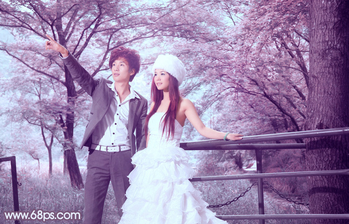蓝紫色是比较浪漫的色调,用通道替换调色是非常快的,替换后得到初步的双色图片,稍微调色即可转为所需的蓝紫色,后期微调人物及局部颜色即可。