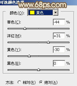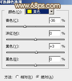 2、创建可选颜色调整图层,对黄色进行调整,参数及效果如下图。这一步给图片增加更多暖色。