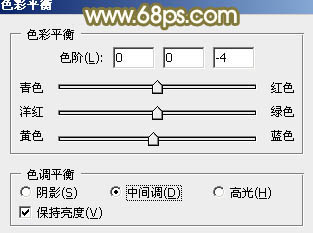10、创建色彩平衡调整调整图层,对中间调及高光进行调整,参数设置如图28,29,确定后把蒙版填充黑色,用白色画笔把人物肤色部分擦出来,效果如图30。这一步微调人物肤色。