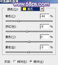 1、打开素材图片,创建可选颜色调整图层,对黄、绿、黑进行调整,参数设置如图1 - 3,效果如图4。这一步把背景部分的绿色转为暗黄色。
