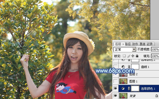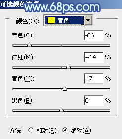 1、打开素材图片,创建可选颜色调整图层,对黄色进行调整,参数及效果如下图。这一步把图片中的黄绿色转为橙黄色。