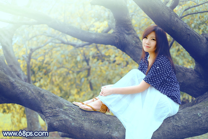 素材图片的取景非常不错,只是图片整体颜色有点暗,色彩通透度不够。调色的时候可以适当在图片的左上角加上类似阳光效果,再把颜色转为稍微鲜一点的暖色即可。