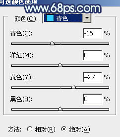 4、创建可选颜色调整图层,对绿、青、黑进行调整,参数设置如图14 - 16,效果如图17。这一步同样给图片暗部增加蓝色。