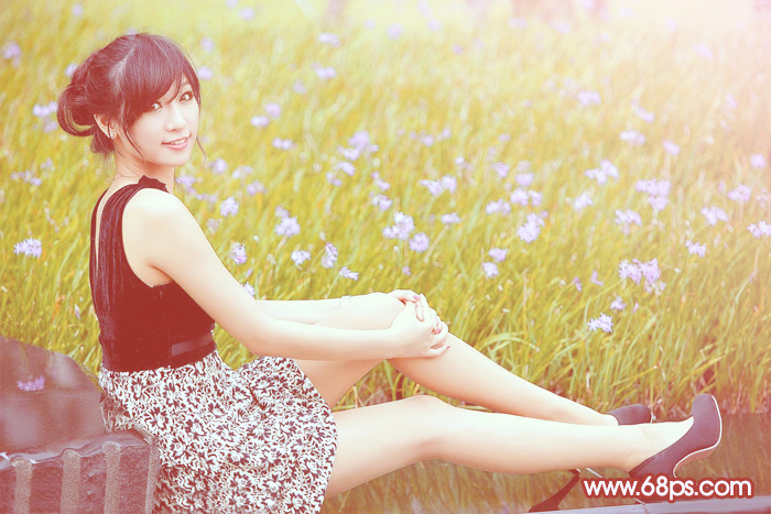 素材图片主色以草地暗绿色为主,颜色不够时尚。调色的时候可以适当把绿色转为橙黄色并调淡,再把图片暗部调亮,局部渲染一点高光,这样整体就会柔和很多,人物也会更甜美。
