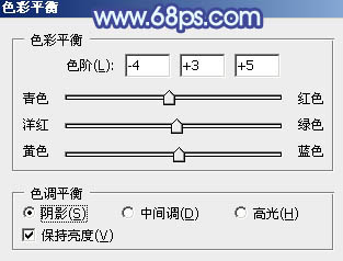 13、创建色彩平衡调整图层,对阴影,高光进行调整,参数及效果如下图。这一步主要给图片高光部分增加蓝色。