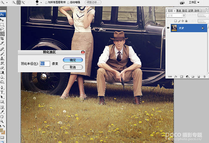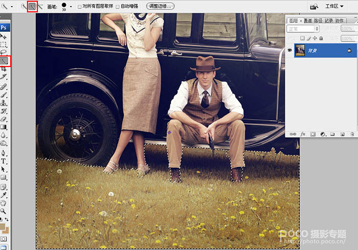 20、选择快速选择工具,点选红色方框内带加号图标,在图片的草地上做出选区。