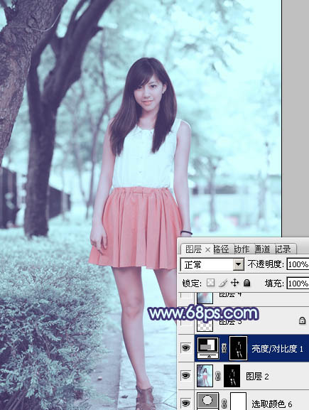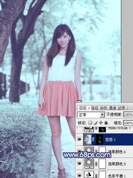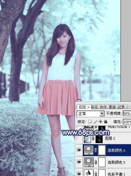 Photoshop给绿树边的美女加上甜美的淡调青蓝色(5)
