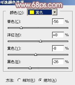 3、创建可选颜色调整图层,对黄,中性色进行调整,参数设置如图7,8,效果如图9。这一步把图片中的暖色稍微调淡。