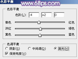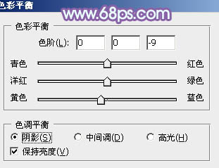 7、创建色彩平衡调整图层,对阴影、中间调、高光进行调整,参数设置如图24 - 26,效果如图27。这一步主要给图片高光部分增加淡蓝色。