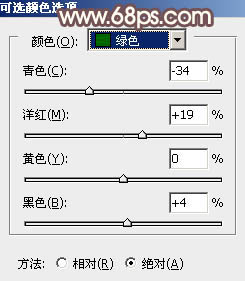 1、打开素材图片,创建可选颜色调整图层,对黄,绿进行调整,参数及效果如下图。这一步把图片主色转为橙黄色。