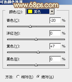 7、创建可选颜色调整图层,对黄色进行调整,参数及效果如下图。这一步给图片增加黄色。