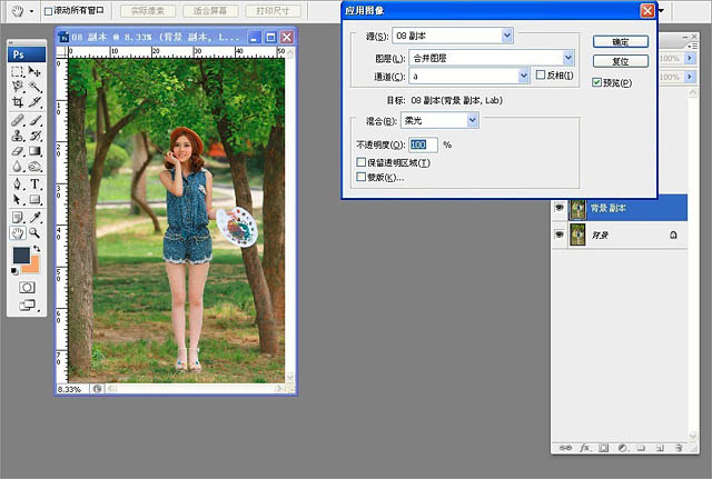 1、由于原片肤色不是很透,首先我们把照片模式换为Lab颜色,打开“应用图像”,选择a通道,并更改图层混合模式为“柔光”,不透明度调整至44%,此步骤可使人物肤色更加红润、通透。确定后回到RGB颜色。