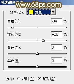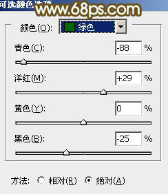2、创建可选颜色调整图层,对黄,绿进行调整,参数设置如图3,4,效果如图5。这一步给背景部分增加橙黄色。