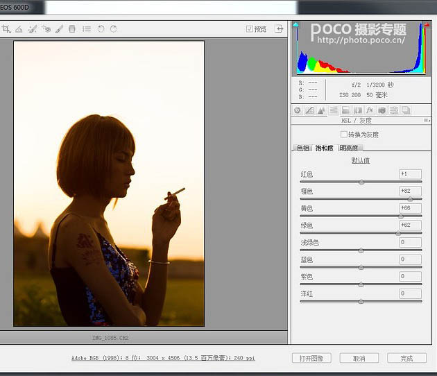 1、RAW格式打开后进行第一部微调,色温往后拉,使其变为暖色调。