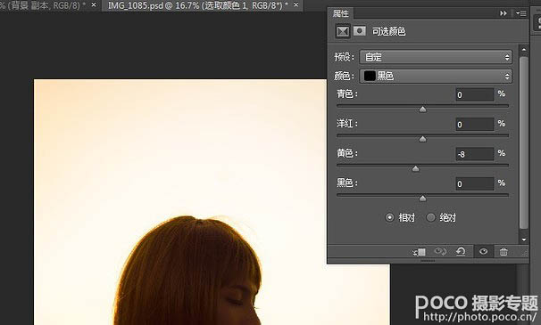 4、可选颜色——黑色——黄色减少,具体参数如下图,数值可以根据自己喜好调整。我个人喜欢暗部稍微偏一点点紫色。
