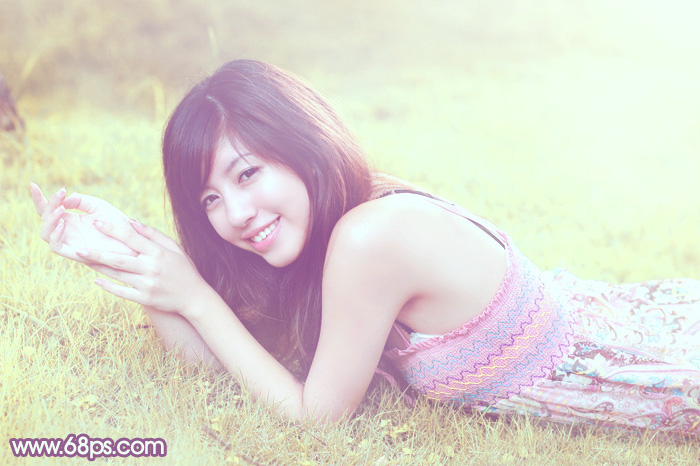 素材图片颜色比较少,比较适合唯美效果。处理的时候可以先把图片的颜色调淡,然后调成自己喜欢的主色,再用滤镜等增加一些淡色或光晕效果,后期渲染一下暗部及高光即可。