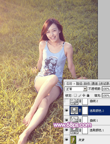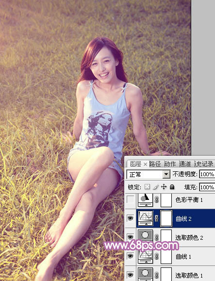 Photoshop给草地上的美女加上柔美的蓝黄色(4)